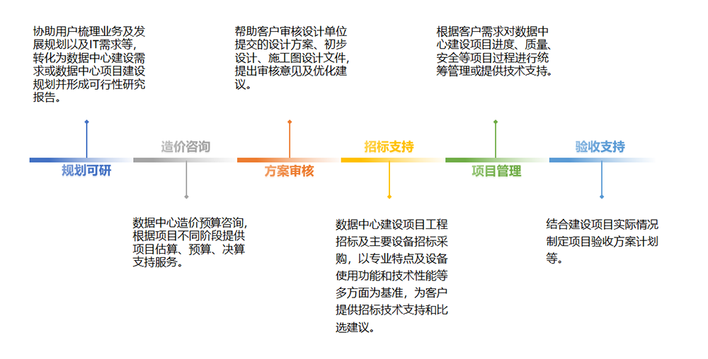 公司拥有多个大型、重点项目的成功经验,以国家及行业相关标准为基准,结合项目实际情况,运用大数据平台做支撑,使用建筑信息化管理、流程管理、项目管理、Smartwe等平台软件,针对数据中心项目全生命周期特点,提供全面的数据中心咨询服务。能够迅速提高用户对项目规划、方案、业务流程、管理需求的认知,有利推动用户项目进展。
